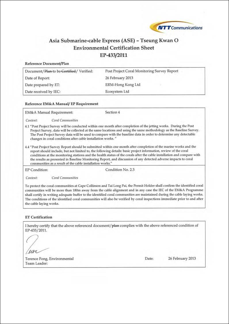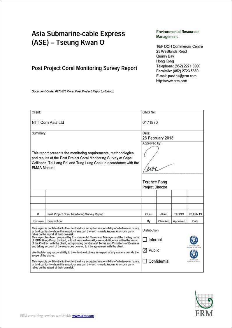 This Post Project Coral Monitoring Survey Report (¡§the Report¡¨) is prepared by ERM-Hong Kong, Limited (ERM) on behalf of NTTCA to present the methodology and findings of the Post Project Coral Monitoring Survey in accordance with requirements of the EM&A Manual.