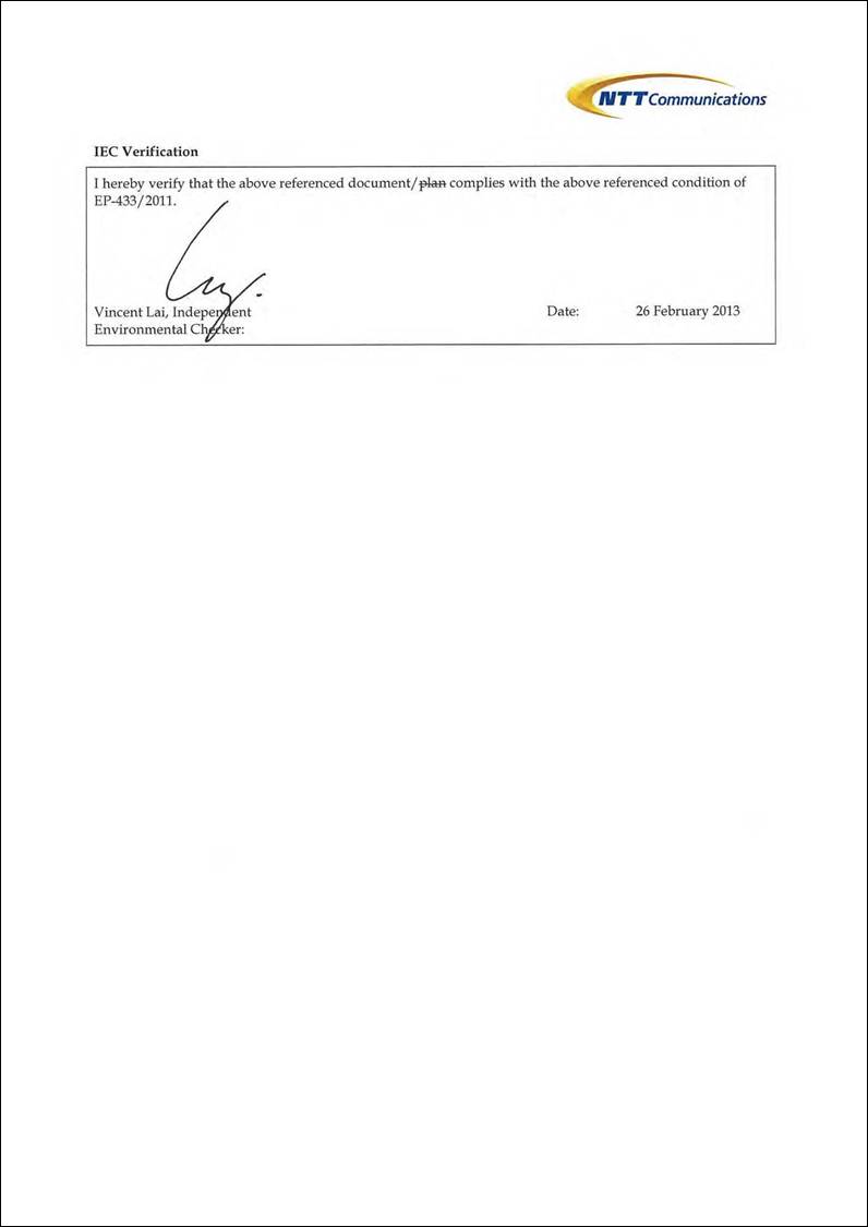 A Project Profile (PP-452/2011) which includes an assessment of the potential environmental impacts associated with the installation of the submarine telecommunications cable system was prepared and submitted to the Environmental Protection Department (EPD) under section 5.(1)(b) and 5.(11) of the Environmental Impact Assessment Ordinance (EIAO) for the application for Permission to apply directly for Environmental Permit (EP).  The Environmental Protection Department, subsequently issued an Environmental Permit (EP- 433/2011) for the Project.  In accordance with the EP conditions, an environmental monitoring and audit (EM&A) programme is required to be implemented in order to track the environmental performance of the cable installation works of the Project.